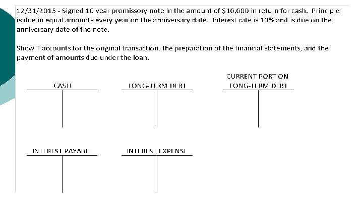 Short-Term Notes Payable JOURNAL Date Accounts and explanation Dec 1 Equipment Debit Credit 30, 000 Note payable, short-term 30, 000 Purchase of Equip. using a 3 -month note payable @ 9% Dec 31 Interest expense 225 Interest payable 225 Accrued interest on note payable (30, 000 x 9% x 1/12) 18