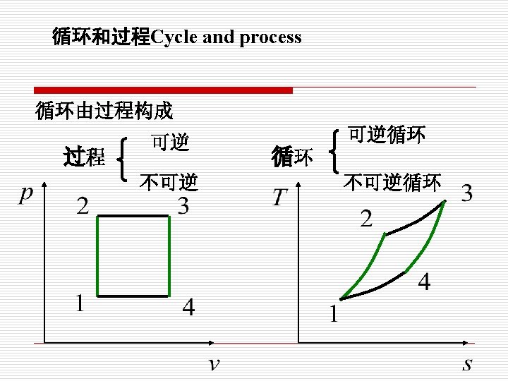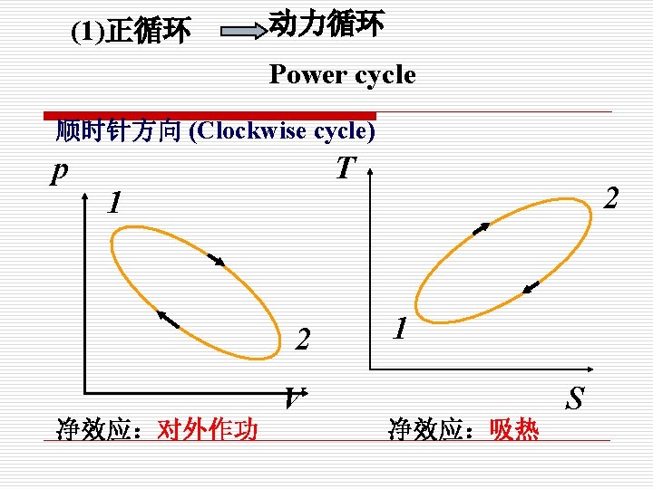 Clockwise cycle (正向循环) p T 1 2 4 3 5 6 8 7 v s The cycle proceeds clockwise (循环按顺时针方 向进行) 1 -2 -3,expand do work on the surrounding 3 -4 -1, compressed and work is done on the system (在P-v图上: 1 -2 -3,对外界作膨胀功, 3 -4 -1,外界压缩系统消耗功。)