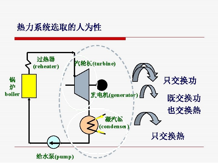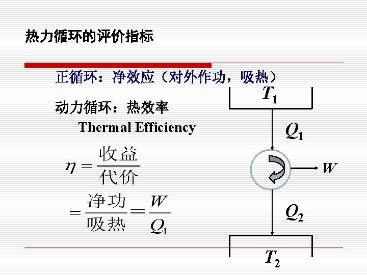 The net work is positive and heat is converted to work. (循环净功wnet=>0), 把 热能转换为功。 在T-s图上: 5 -6 -7,absorb heat from the high temperature reservoir(从高温 热源吸 热qq ) , 7 -8 -5,reject heat to low temperature reservoir (向低温热源放热qq) The net heat flow (净热量)is qnet=qqqq, and wnet=qn