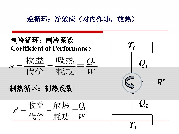 逆循环 制冷循环 Refrigeration cycle 逆时针方向 (Counter-clockwise Cycle) p T 1 2 V 净效应:对内作功 2 1 净效应:放热 S