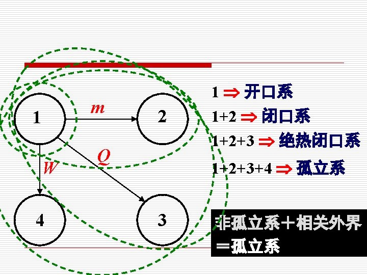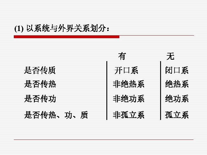 B. 绝热系统和孤立系统 Adiabatic system and Isolated system 绝热系统与外界之间无热量交换 Adiabatic system is that no heat cross the boundary or heat is negligible compared with work cross the boundary 孤立系统与外界之间无任何物质和能量交换 Isolated system is a special case that no mass and energy cross the boundary.