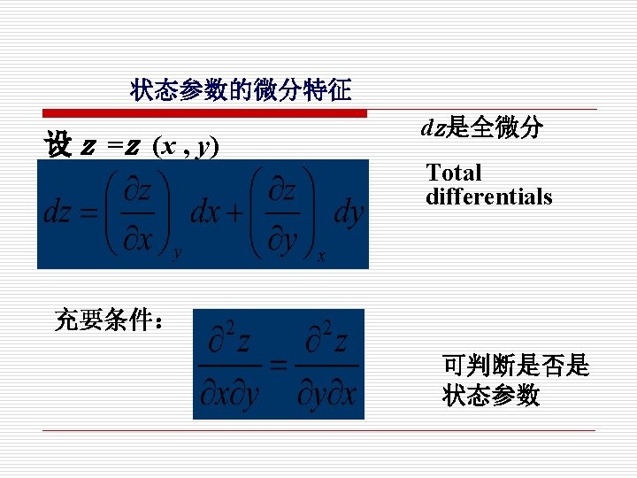 §After a series of change, the state returns to the original one, then the changes in its properties are ‘ 0’ C. 状态参数的微分特征:全微分 Properties are functions of state, there exist differential for properties