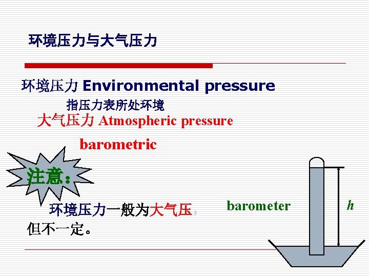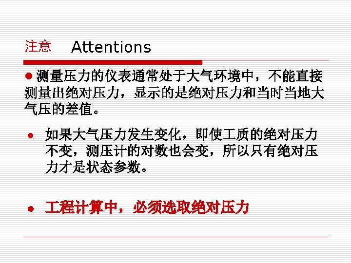 其他单位 Other units 1 bar =105 Pa=100 k. Pa =0. 1 MPa 标准大气压 Standard atmosphere 1 atm= 101325 Pa=101. 325 k. Pa 程大气压 Engineer atmosphere 1 at=1 kgf/cm 2 =9. 807 N/cm 2 =9. 807*104 Pa 液柱高度 Height of liquid column 1 atm=760 mm Hg 1 at =10 m H 2 O 1 mm. Hg=1ρgh =133. 3 Pa