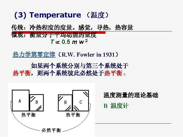 Equality of temperature is a necessary and sufficient condition for thermal equilibrium, i. e. no transfer of heat. (温度相等是热平衡的充要条件)