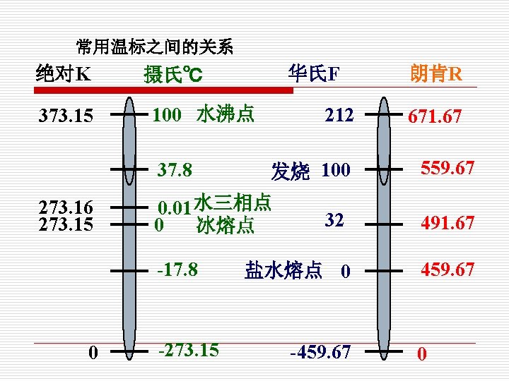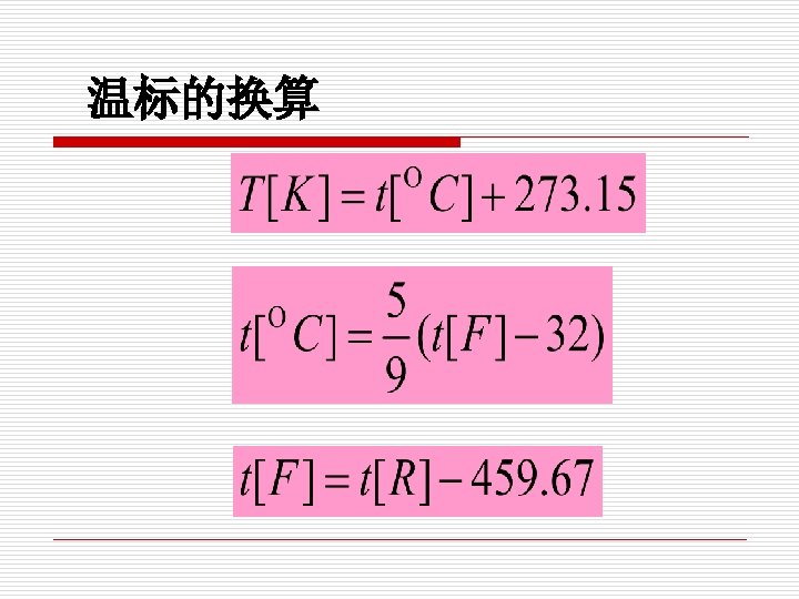 温标 Temperature scale l 热力学温标(绝对温标)Kelvin scale l �氏温� Celsius scale Temperature 273. 16 K 0. 01 ℃ The temperature interval on both scales is the same. l 华氏温标Fahrenheit scale (German, G. Fahrenheit, 1686 -1736) l 朗肯温标Rankine scale (W. Rankine, 1820 -1872)