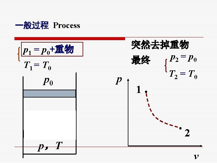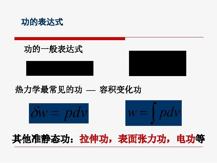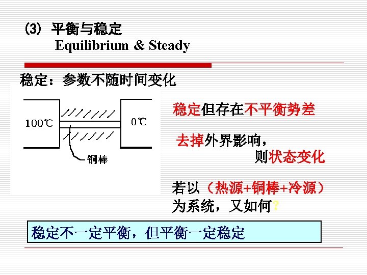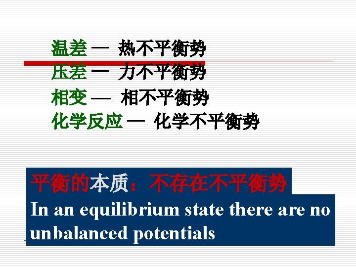 l 热平衡(Thermal equilibrium ) If the temperature is the same throughout the entire system. 温差 Temperature differential 热不平衡势Unbalanced potentials l 力平衡 (Mechanical equilibrium ) If there is no change in pressure at any point of the system with time. 压差 Pressure differential 力不平衡势Unbalanced potentials