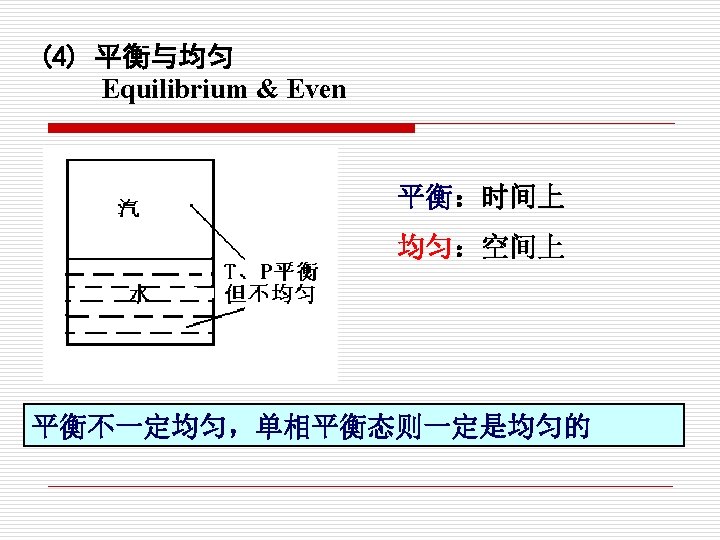相平衡(Phase equilibrium) If a system involves two phases, when the mass of each phase reaches an equilibrium level and stays there , it is in phase equilibrium. § 化学平衡 (Chemical equilibrium ) If no chemical reaction occur, that is, the chemical composition does not change with time, a system is in chemical §