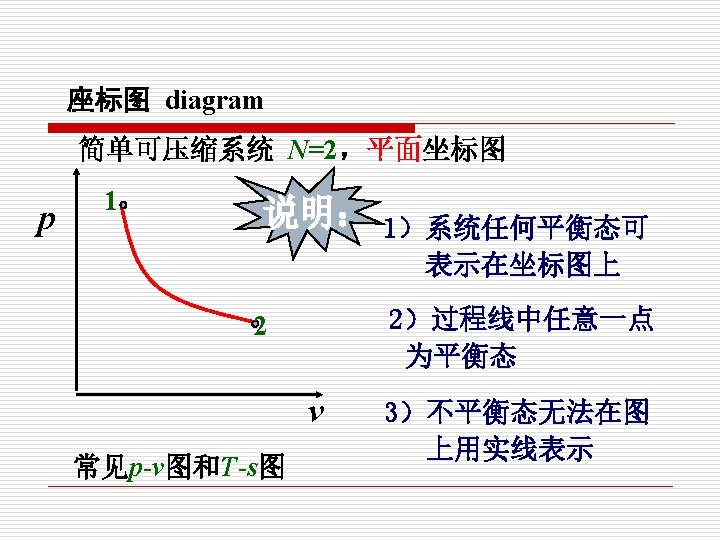 2. 状态公理 The State Postulate 系统的平衡状态可以用确定的参数来描述 The equilibrium state of a system can be described by a set of properties. However, specify a certain number of properties is sufficient to fix a state. (1) 想确切描述某个热力系,是 否需要所有状态参数?