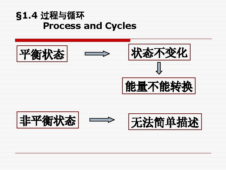 第一章 基本概念 Chapter 1. Basic Concepts Ø 热力系统(Thermodynamic System) Ø 系统的状态参数(Properties of A System) Ø 状态及平衡状态(State and Equilibrium) Ø 过程与循环(Process and Cycles)