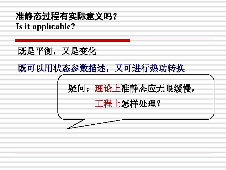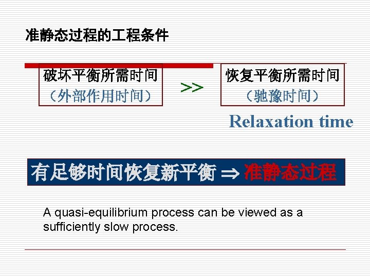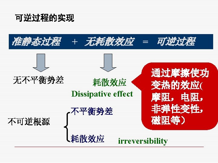 l 可逆过程必然是准静态过程,但准静态过程不一定是可逆过程 Reversible process must be quasi-equilibrium process. However,quasi-equilibrium process is not definitely reversible process. l 简单地说,可逆过程就是没有耗散效应的准静态过程 In brief, reversible process is a quasi-equilibrium process without dissipative process.