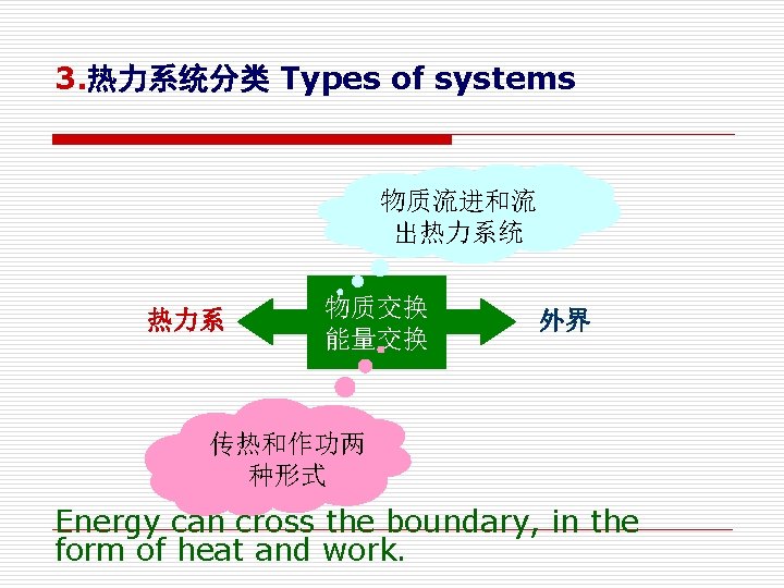 2. 系统,外界和边界 System, Surroundings and boundary (1) 外界(Surroundings) The mass or region outside the system (2)边界(Boundary) The real or imaginary surface that separates the system from its surroundings. (3) 系统与外界之间的质量及能量交换都必须穿越边界 The mass or energy exchange between system and its surroundings must cross the boundaries.