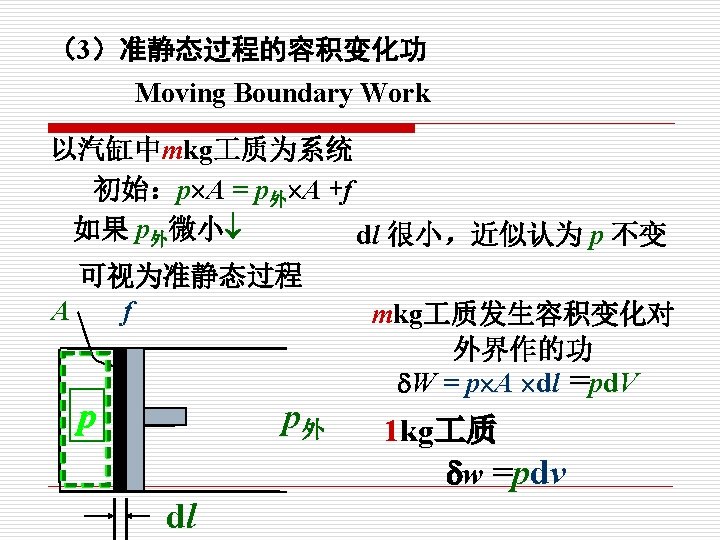 简单可压缩系统 Simple compressible system 最重要的系统 只交换热量和一种准静态的容积变化功 Moving Boundary Work 容积变化功 Compression Work 压缩功 膨胀功 Expansion Work