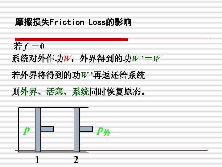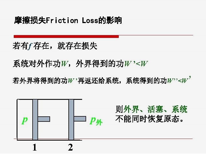 This requires that the working fluid goes through a continuous series of equilibrium states. A reversible process should satisfy the following criteria: l 质与环境之间的温差和压差必须无限小 The temperature and pressure difference between the working fluid and its surroundings should be infinitely small. l没有内部或机械摩擦损失--没有耗散效应 No internal or mechanical friction is allowed. ----no dissipative effect.