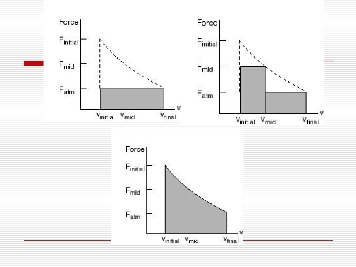 (2) 如何实现可逆过程? How to fulfill reversible process? For example, suppose we have a thermally insulated cylinder that holds an ideal gas. The gas is contained by a thermally insulated massless piston with a stack of many small weights on top of it. Initially the system is in mechanical and thermal equilibrium. Consider the following three processes: A. All of the weights are removed from the piston instantaneously and the gas expands until its volume is increased by a factor of four (a free expansion). B. Half of the weight is removed from the piston instantaneously, the system is allowed to double in volume, and then the remaining half of the weight is instantaneously removed from the piston and the gas is allowed to expand until its volume is again doubled. C. Each small weight is removed from the piston one at a time, so that the pressure inside the cylinder is always in equilibrium with the weight on top of the piston. When the last weight is removed, the volume has increased by a factor of four.
