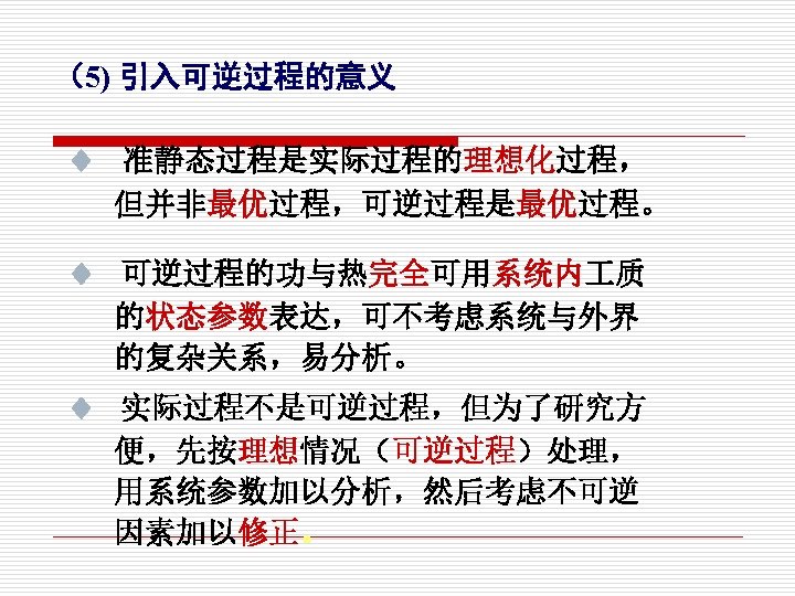 2. Reversible process (可逆过程) (1)定义(Definition) 系统经历某一过程后,如果能使系统与外界 同时恢复到初始状态,而不留下任何痕迹,则此过 程为可逆过程。 A process that can reversed without leaving any trace on the surroundings. That is, both the system 注意 and the surroundings are returned to their initial states at the end of the reverse process. 可逆过程只是指可能性,并不 是指必须要回到初态的过程。