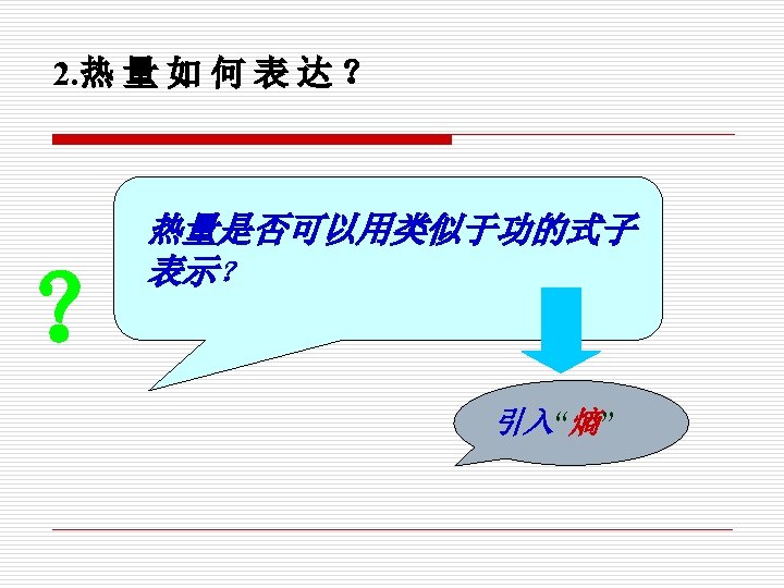 § 1 -6 热量与熵 Heat and Entropy 1. 热量定义:热量是热力系与外界相互作用的另一 种方式,在温度的推动下,以微观无序运动方式传 递的能量。 Heat is defined as the form of energy that is transferred between two systems (or its surroundings) by virtue of a temperature difference.