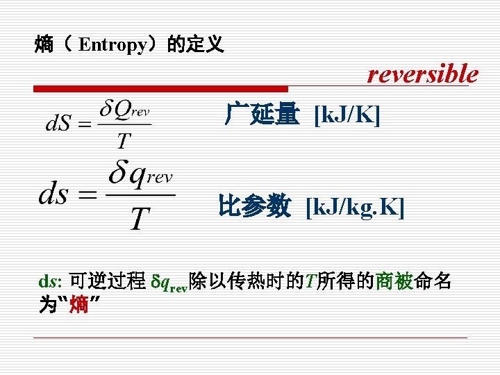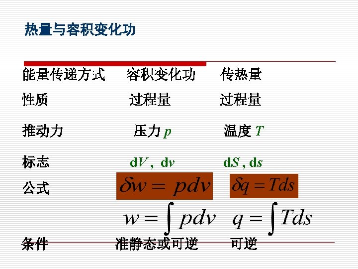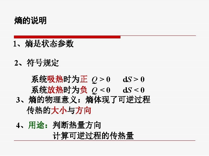 § 在可逆过程结束时,系统和外界都回复到原来的状态 Both the system and the surroundings are returned to their initial states at the end of the reverse process. § 系统与环境组合系统的净热量与净功量之和为零 The net heat and net work exchange between the system and the surroundings is zero for the combined ( original and reverse) process.