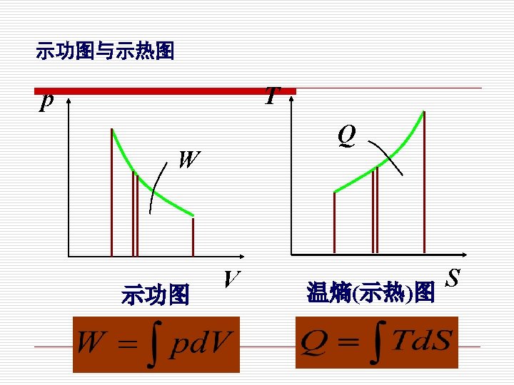 3. 可逆过程的热量和功量 Work and heat in reversible process The work input to a system during a reversible process is: W= Marked area on the P-V diagram. The heat supplied to a system during a reversibl process is: Q= Marked area on the T-s diagram.