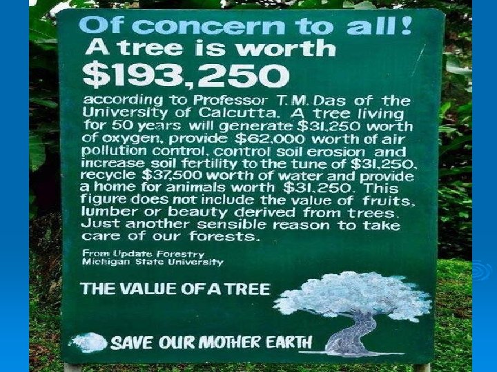 Valuation: put a dollar value on natural resources & services Ø How much value do bees provide farmers by pollinating crops? Ø How much value does a coral reef which protects coastlines from strong waves have? Ø How much are the natural water purification & waste decomposition of soil worth?