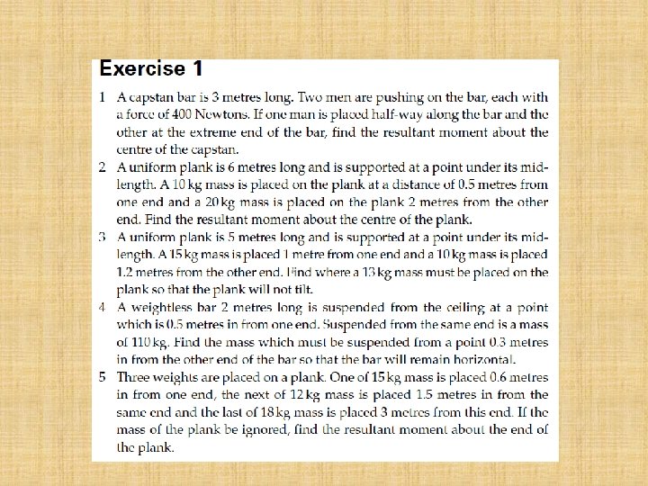 Moments are taken about O, the middle of the plank. Clockwise moment = 30 X 0. 5 = 15 kg m Anti-clockwise moment = 10 X 1. 0 = 10 kg m Resultant moment 5 kg m clockwise 3 m 0. 5 1 m 10 kg 0. 5 1 m 30 kg