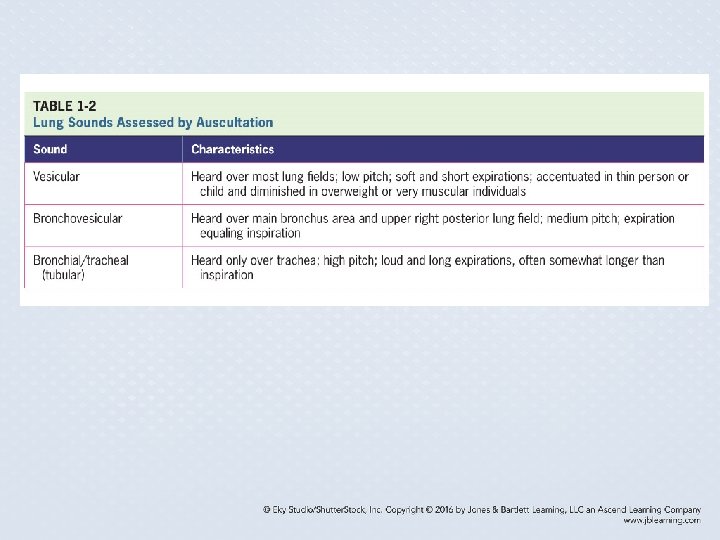 Auscultation • Intensity of breath sounds • Presence of adventitious breath sounds: crackles, rhonchi, wheezes, stridor, pleural friction rub • Symmetry of breath sounds • Bronchophony, egophony, and whispered pectoriloquy