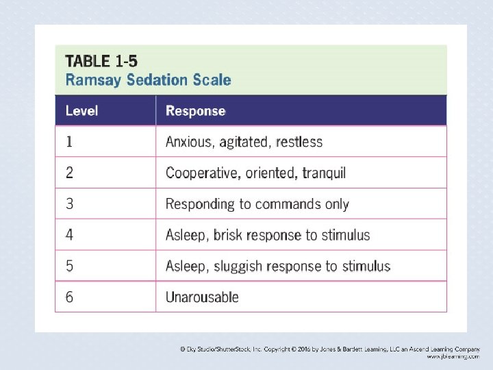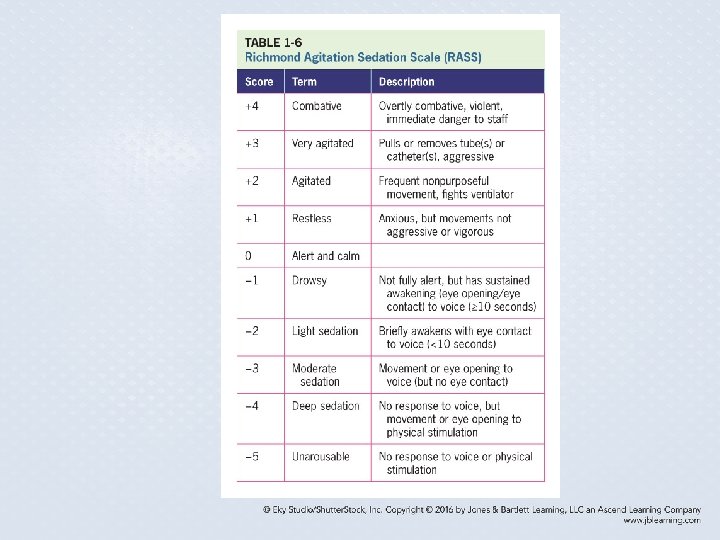 Key Points • Auscultation of heart sounds includes notations of rate and rhythm, extra heart sounds, and murmurs. • Glasgow Coma Scale is used to assess the level of consciousness. • The level of sedation in critically ill, mechanically ventilated patients the Ramsey score or the Richmond Agitation Sedation Scale is used. • Delirium is measured with the CAM score.