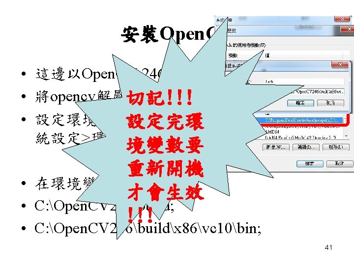 Open. CV 安裝 • http: //opencv. org/downloads. html 40