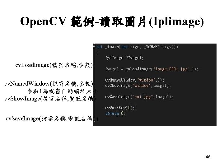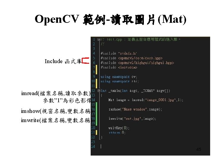 • 連結器>輸入>其他相依性> – – – opencv_core 246 d. lib opencv_calib 3 d 246 d. lib opencv_contrib 246 d. lib opencv_features 2 d 246 d. lib opencv_highgui 246 d. lib opencv_imgproc 246 d. lib opencv_ml 246 d. lib opencv_objdetect 246 d. lib opencv_videostab 246 d. lib opencv_nonfree 246 d. lib opencv_flann 246 d. lib 44