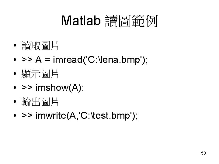 Open. CV函式 • 讀取圖片 – Imread() – cv. Load. Image() • 輸出圖片 – Imwrite() – cv. Save. Image() • 讀取影片 – Video. Capture • 改變圖片大小 – cv. Resize() • 其餘的可以上Open. CV官網查詢 – http: //docs. opencv. org/modules/refman. html 47