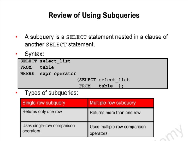 Review of using subqueries • Subqueries can be placed after : – WHERE clause – FROM clause – HAVING clause • Single row subqueries use single row operators such as = , <>, <, > • Multiple row subqueries use operators IN, ANY, ALL • Example: select last_name From employees Where salary = (select Min(salary) from employees);