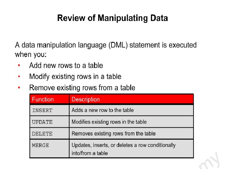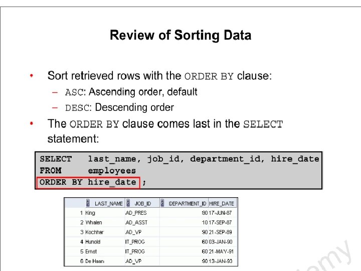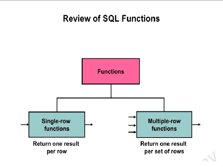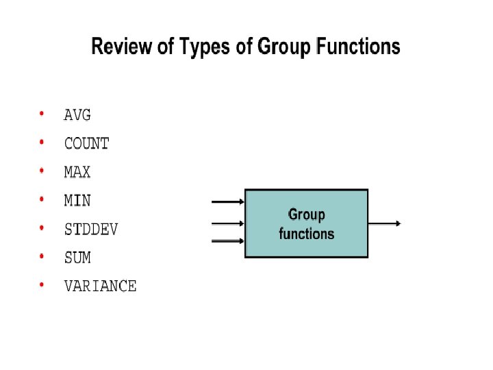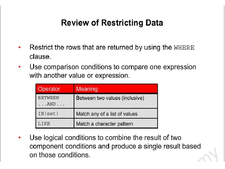 Reviews of restricting Data • The WHERE Clause can compare values in columns, literal values, arthmetic expressions and functions • WHERE clause format: – WHERE expr operator value • Comparison conditions: <, > ==, <>, <= • Three logical operator available: – And – Or – Not
