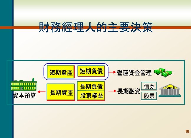 Financial Management Decisions • Capital budgeting • What long-term investments or projects should the business take on? • Capital structure • How should we pay for our assets? • Should we use debt or equity? • Working capital management • How do we manage the day-to-day finances of the firm? 9