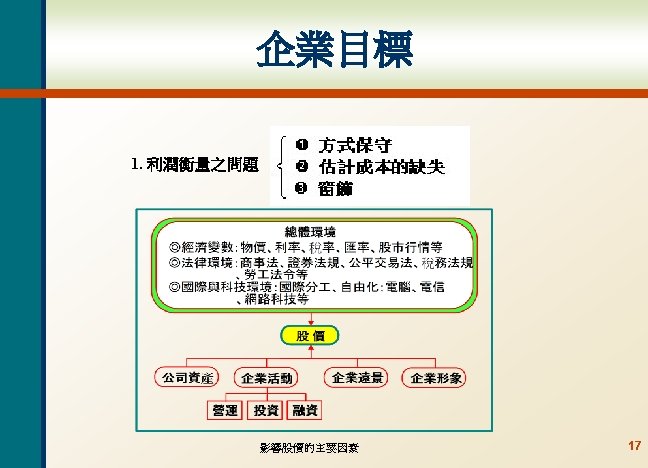Goal Of Financial Management • What should be the goal of a corporation? • • Maximize profit? Minimize costs? Maximize market share? Maximize the current value of the company’s stock? • Does this mean we should do anything and everything to maximize owner wealth? 16