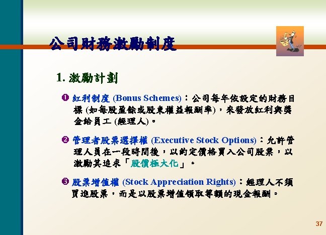 Managing Managers • Managerial compensation • Incentives can be used to align management and stockholder interests • The incentives need to be structured carefully to make sure that they achieve their goal • Corporate control • The threat of a takeover may result in better management • Other stakeholders 22