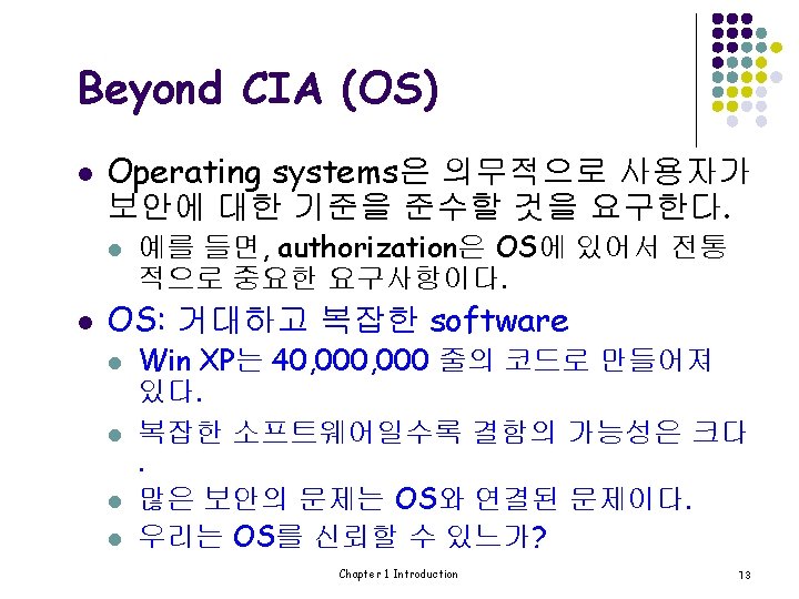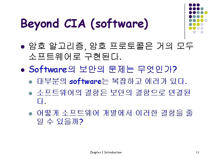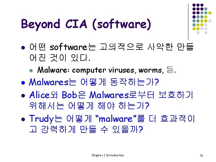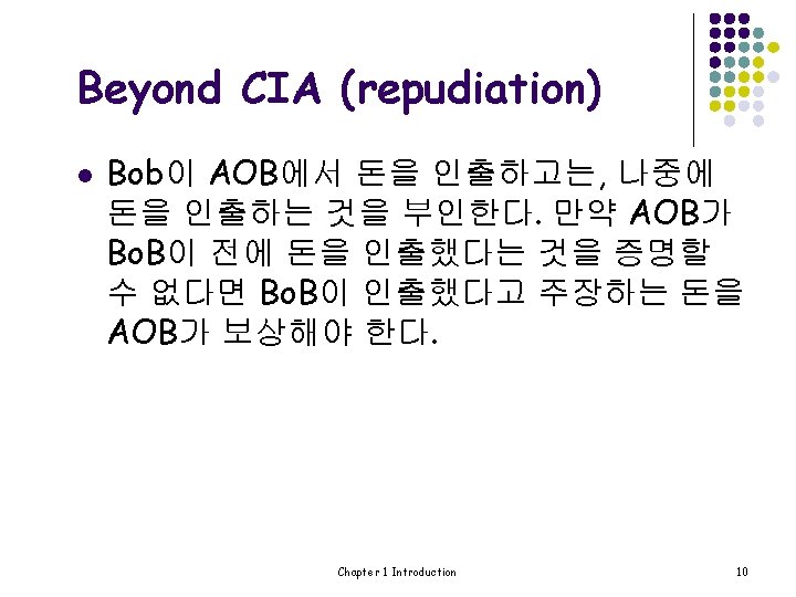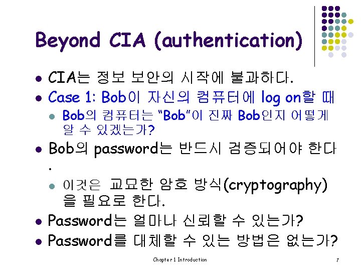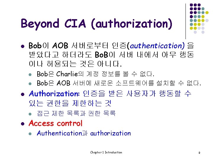 Beyond CIA (authentication) l Case 2: Bob이 AOB 서버에 접속할 때 l l AOB 서버는 “Bob”이 진짜 Bob인지 어떻게 알 수 있을까 ? Case 1과 마찬가지로 Bob의 password는 반드시 검 증되어야 한다. 그러나 Case 1의 standalone 경우와는 다르게 network security 문제가 제기된다. network security의 문제는 무엇인가? l Security Protocol은 중요한 역할을 한다. Chapter 1 Introduction 8