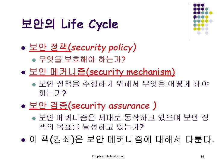 Text Book l 교재는 다음의 4부분으로 구성되어 있다. l 암호(Cryptography) l 접근 제어(Access control) l 보안 프로토콜(Security Protocols) l 소프트웨어(Software) Chapter 1 Introduction 15