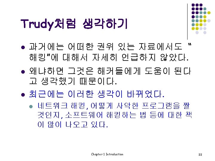 Software l Operating systems l l l 기본적인 OS의 보안 문제 신뢰할 수 있는 OS의 요구사항 NGSCB(“n-scub): Microsoft’s trusted OS for PC l l Next Generation Secure Computing Base Software는 커다란 보안의 주제이다. l l 많은 자료가 이것을 다루고 있다. 다루어야 할 많은 보안의 문제가 있다. Chapter 1 Introduction 21