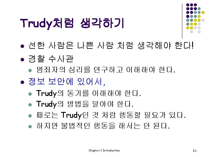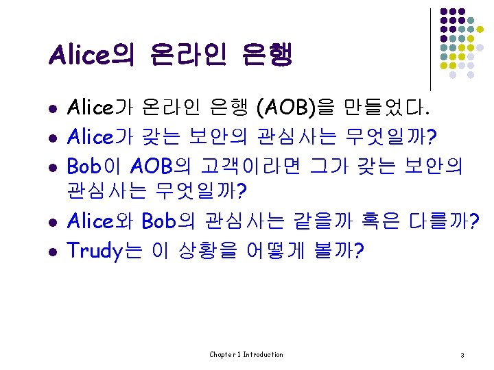 등장 인물 l Alice와 Bob: 착한 사람들 l Trudy: 나쁜 사람 l Trudy는 “intruder”의 일반적 이름 Chapter 1 Introduction 2