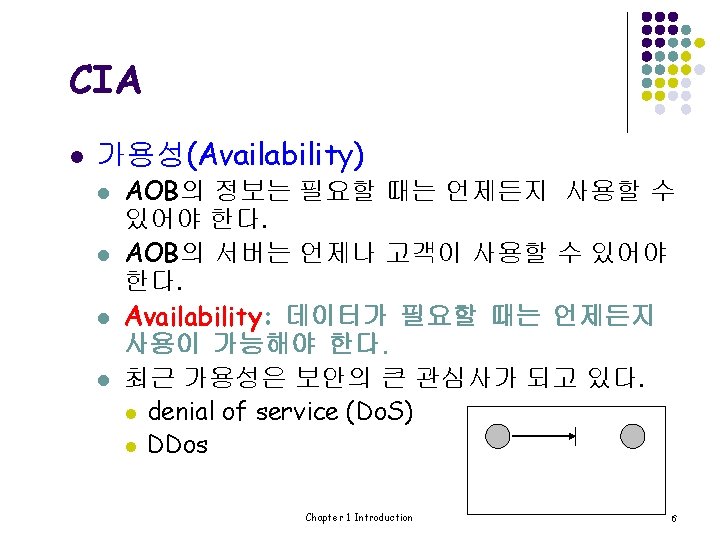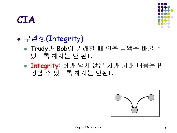CIA l l CIA: Confidentiality, Integrity, and Availability 기밀성(Confidentiality, privacy) l l AOB는 Trudy가 Bob의 거래 내용을 볼 수 없도 록 해야 한다. 기밀성: 허가 받지않은 자가 정보를 읽지 못하 도록 하는 것 Chapter 1 Introduction 4