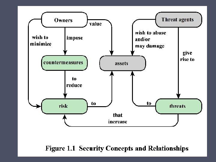 Vulnerabilities, Threats and Attacks • Categories of vulnerabilities • Corrupted (loss of integrity) • Leaky (loss of confidentiality) • Unavailable or very slow (loss of availability) • Threats • Capable of exploiting vulnerabilities • Represent potential security harm to an asset • Attacks (threats carried out) • Passive – attempt to learn or make use of information from the system that does not affect system resources • Active – attempt to alter system resources or affect their operation • Insider – initiated by an entity inside the security parameter • Outsider – initiated from outside the perimeter
