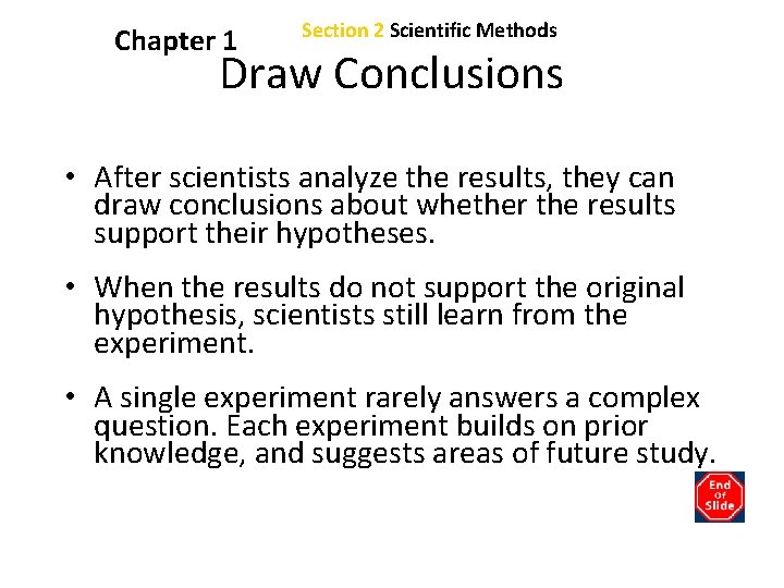 Chapter 1 Section 2 Scientific Methods Draw Conclusions • After scientists analyze the results, they can draw conclusions about whether the results support their hypotheses. • When the results do not support the original hypothesis, scientists still learn from the experiment. • A single experiment rarely answers a complex question. Each experiment builds on prior knowledge, and suggests areas of future study.