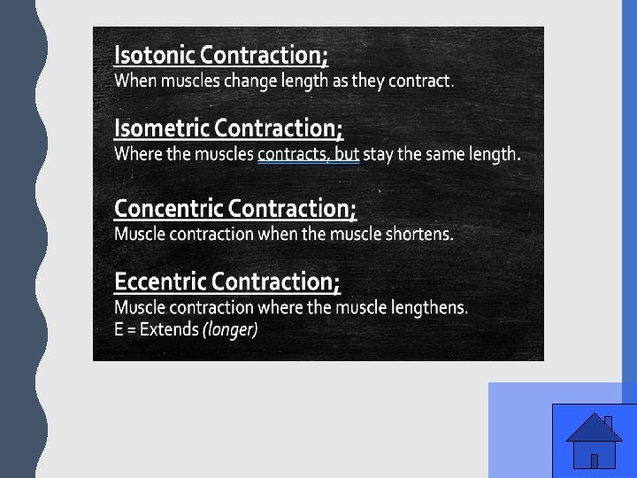 Muscular – 400 Points Name the 4 main muscle contractions. Bonus points (25 each) if you can explain what happens to the muscle with each contraction.
