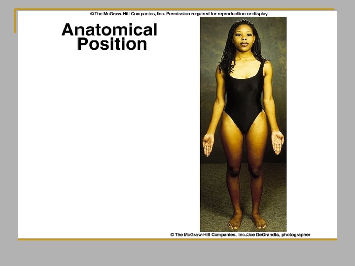 LANGUAGE OF ANATOMY n n Anatomists have adopted set of terms that allow body structures to be located and identified Anatomical position – standard position used as reference point Face-front diagrams pg. 12 DO THIS: Stand up and assume anatomical position