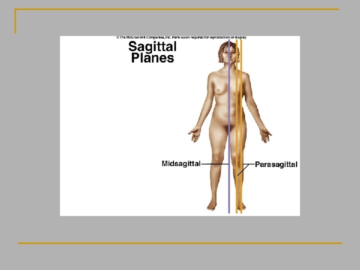 n SAGITTAL SECTION – cut made along the lengthwise (longitudinal) plane - Divides body into right & left sides - Midsagittal – cut made down median plane; r & l sides are equal