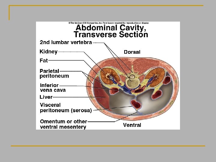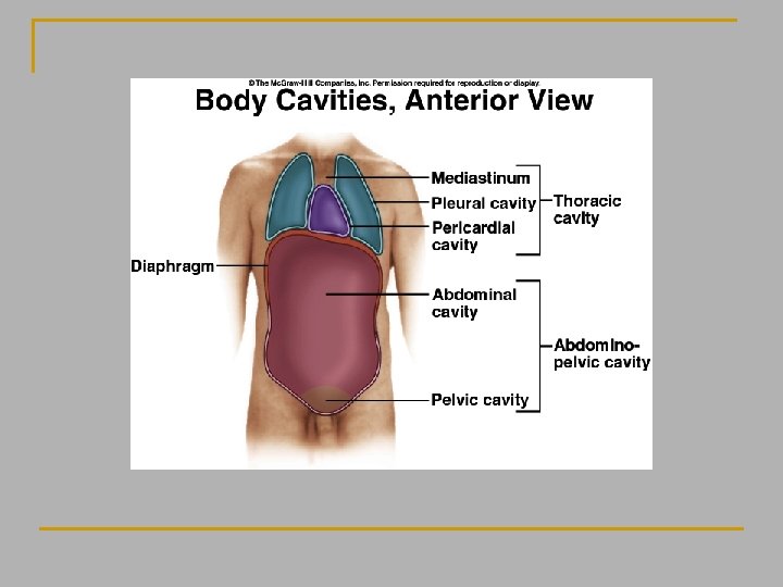 n VENTRAL BODY CAVITY- n Contains all structures within chest & abdomen Thoracic cavity: separated from rest by diaphragm Abdominopelvic cavity: inferior to diaphragm Pg. 17 - -