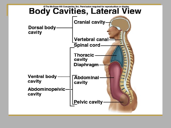 BODY CAVITIES n 2 SETS: n DORSAL BODY CAVITYCranial cavity: space inside bony skull Spinal cavity: from cranium to end of vertebral column -