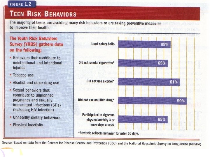 6 categories of Risk Behaviors in Teens • • • Behaviors that result in injuries Tobacco use Alcohol & drugs Sexual behaviors Poor Diet Lack of Physical Activity