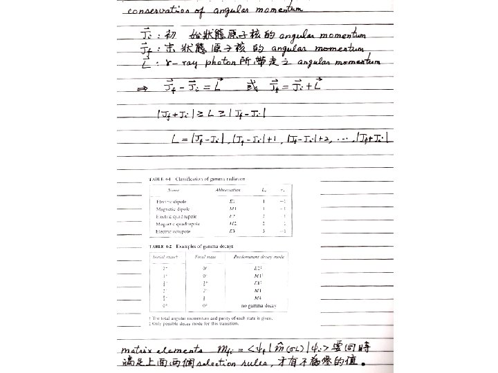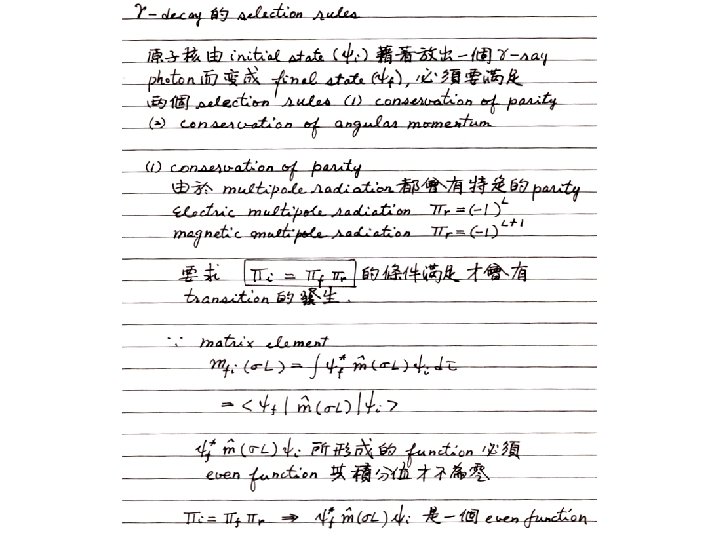 § 10 -1 Introduction 1. Most αandβdecays, leave the final nucleus in an excited state. Theses excited states decay rapidly to the ground state through the emission of one or moreγrays, which are photons of electromagnetic radiation. 2. Gamma rays have energy difference between the range of 0. 1 to 10 Me. V. 3. The detail and richness of out knowledge of nuclear spectroscopy depends on what we know of the excited states, and so studies of γ−ray emission have become the standard technique of nuclear spectroscopy. 4. Gamma rays are relatively easy to observe (negligible absorption and scattering in air) and their energies can be measured with high accuracy which allows good quality determination of energies on nuclear excited states. 5. Spins and parities of nuclear excited states can be deduced by properties of γdecays.