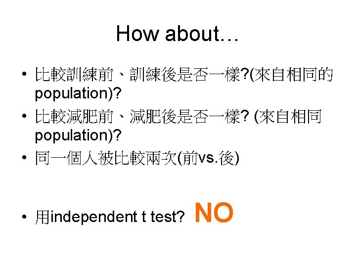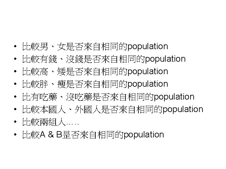 Independent t test • Independent t test = 兩獨立樣本檢定 Independent-measure t test = Two mean t test • Goal: to evaluate the mean difference between two population ( 1 vs. 2) • 無法得知 1 & 2 所以用什麼取代? ? • Independent-measure t test vs. repeatedmeasure t test