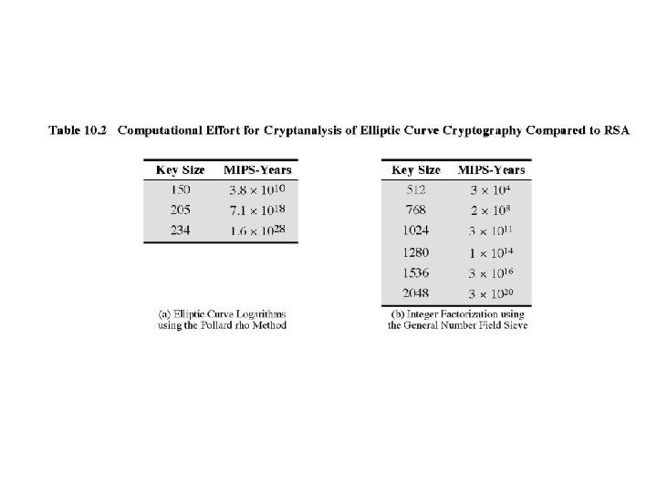 Elliptic Curve Cryptography • ECC addition is analog of multiply • ECC repeated addition is analog of exponentiation • need “hard” problem equiv to discrete log – – Q=k. P, where Q, P are points in an elliptic curve is “easy” to compute Q given k, P but “hard” to find k given Q, P known as the elliptic curve logarithm problem • Certicom example: E 23(9, 17) (P. 305) – k could be so large as to make brute-force fail